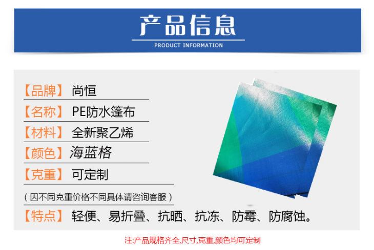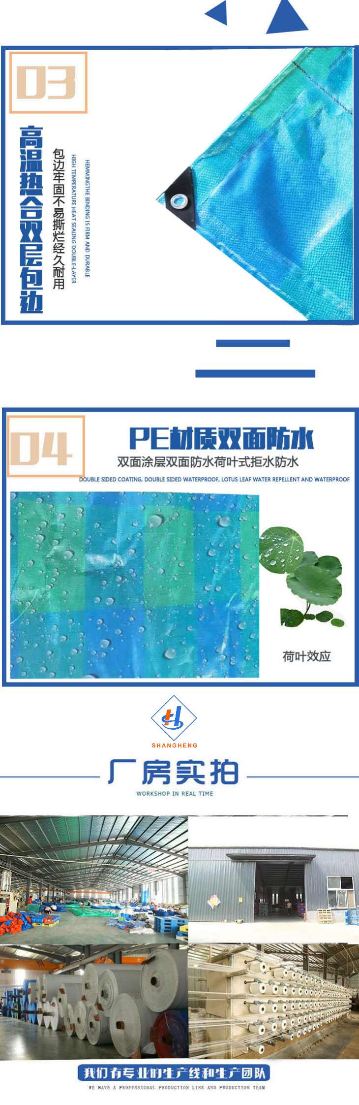 海藍(lán)格色PE防水篷布3、高溫?zé)岷想p層包邊,包邊牢固不易撕爛經(jīng)久耐用;4、PE材質(zhì)雙面防水雙面涂層雙面防水,荷葉式聚水防水。臨沂尚恒篷布廠家實(shí)拍,篷布源頭生產(chǎn)廠家。