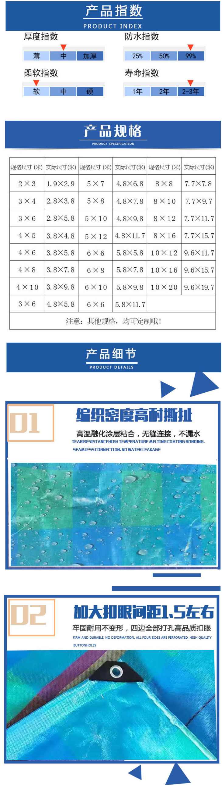 海藍(lán)格色PE防水篷布產(chǎn)品細(xì)節(jié),1、編織密度高耐撕扯,高溫融化涂層粘合,無(wú)縫拼接,不漏水;2、加大扣眼間距1.5米左右,牢固耐用不變形,四邊全部打孔高品質(zhì)扣眼。